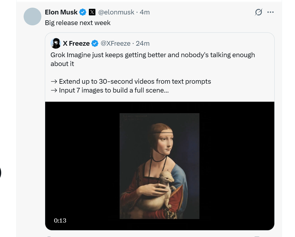 稍早前,马斯克在社交平台X上表示,Grok Imagine下周将有重大发布。