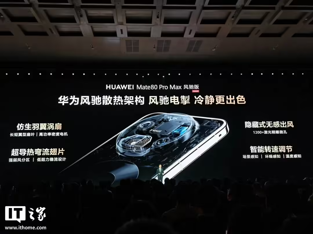 2026 年 3 月,华为 Mate 80 Pro Max 风驰版终于把这个技术带到了主流旗舰上。它的仿生羽翼涡扇藏在摄像头模组下方,用官方的话说叫“隐藏式无感出风”,这个无感不但体现在风扇转动时几乎没有声音,而且使用手机的人也很难感知高负载运行时产生的额外热量。