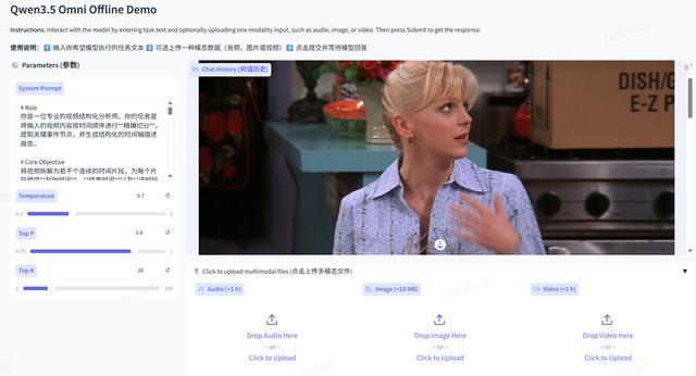 实测中,我们向Qwen3.5-Omni-Plus上传了一集50分钟左右的美剧《老友记》,并让它按照系统提示词的要求,输出画面内容的准确描述。