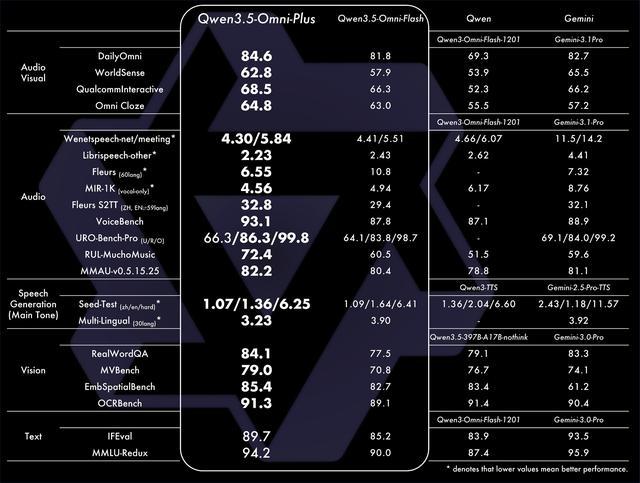 千问团队在技术博客中称,在215项音频/音视频的理解、推理和交互任务上,Qwen3.5-Omni-Plus取得了SOTA成绩。这一模型的通用音频理解、推理、识别、翻译、对话超越了Gemini-3.1 Pro,音视频理解能力总体达到Gemini-3.1 Pro水平。同时,视觉和文本能力与同尺寸Qwen3.5模型持平。