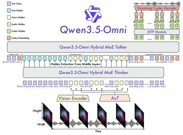 Qwen3.5-Omni延续了上一代的Thinker-Talker分工架构——Thinker负责理解,Talker负责表达。但这一次,两者都改为Hybrid-Attention MoE(混合注意力MoE),提升了模型效率和性能。