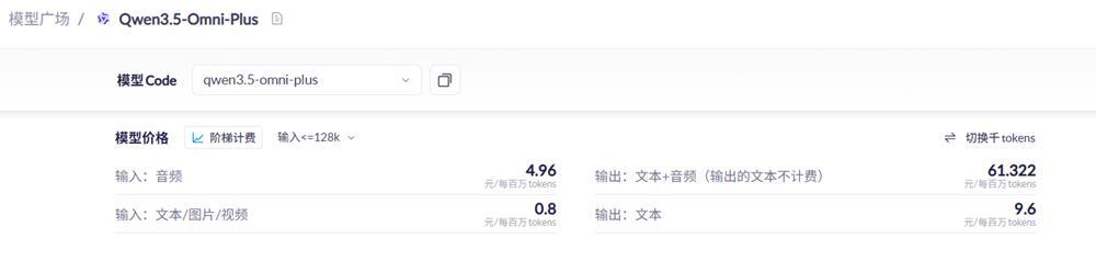 这一模型的API调用价格采取阶梯计费模式,在常用的输入≤128k场景下,其音频输入价格为4.96元/百万tokens,文本/图片/视频输入价格为0.8元/百万tokens。模型的输出价格为61.322元/百万tokens(文本+音频),仅输出文本时的价格为9.6元/百万tokens。