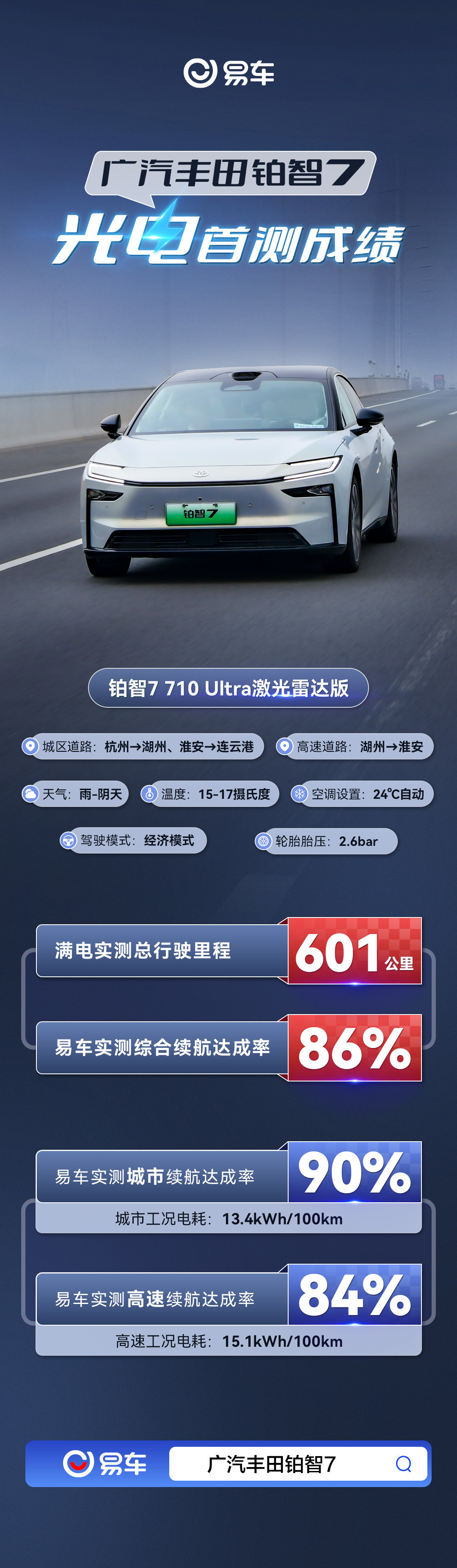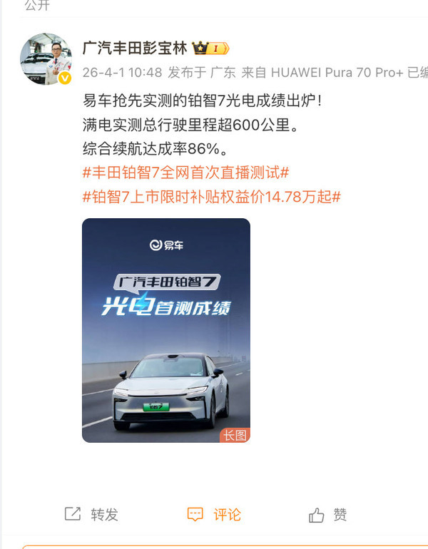 【CNMO科技消息】4月1日,广汽丰田铂智7 710 Ultra激光雷达版光电续航实测结果正式公布。在包含城市与高速路段的综合工况下,铂智7满电实测总行驶里程达到601公里,综合续航达成率为86%。