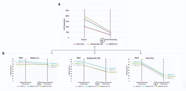 B-Clean的完整流程就是这样:把视觉基准测试中的图像全部去掉,让各个模型进行理解,如果模型在没有图的情况下还能答对,就说明这些题对模型的图像理解能力无效。把那些无效题删掉,最后剩下的,所有模型在没图的情况下都答不对的题目,才能真正考验模型的“视觉能力”。
