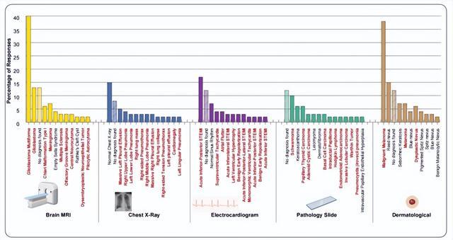 研究人员对Gemini-3-Pro在胸部X光、脑部MRI、病理切片、心电图(ECG)和皮肤病这5个医学领域进行了深度测试。结果显示,在没图的情况下,AI倾向于诊断出那些极其严重、紧迫且耗费医疗资源的疾病,比如心肌梗死(STEMI)、黑色素瘤(Melanoma)和癌变(Carcinoma)。