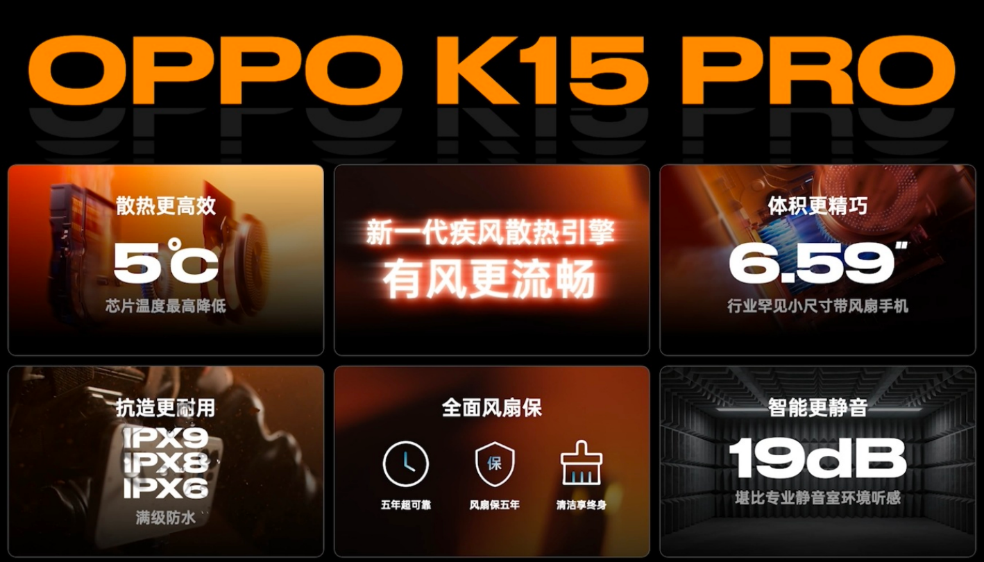 凤凰网科技讯 4月1日,OPPO发布K15 Pro系列智能手机,包含K15 Pro和K15 Pro+两款机型。K15 Pro搭载天玑8500 SUPER处理器,配备6.59英寸144Hz屏幕;K15 Pro+搭载天玑9500S处理器,配备6.78英寸165Hz屏幕。两款机型均搭载新一代疾风散热引擎,采用疏密错位散热鳍片、VC均热板及石墨凝胶,风扇进风口微凸不足1毫米,50%转速下噪音低至19dB,整机通过IP69防尘防水认证。
