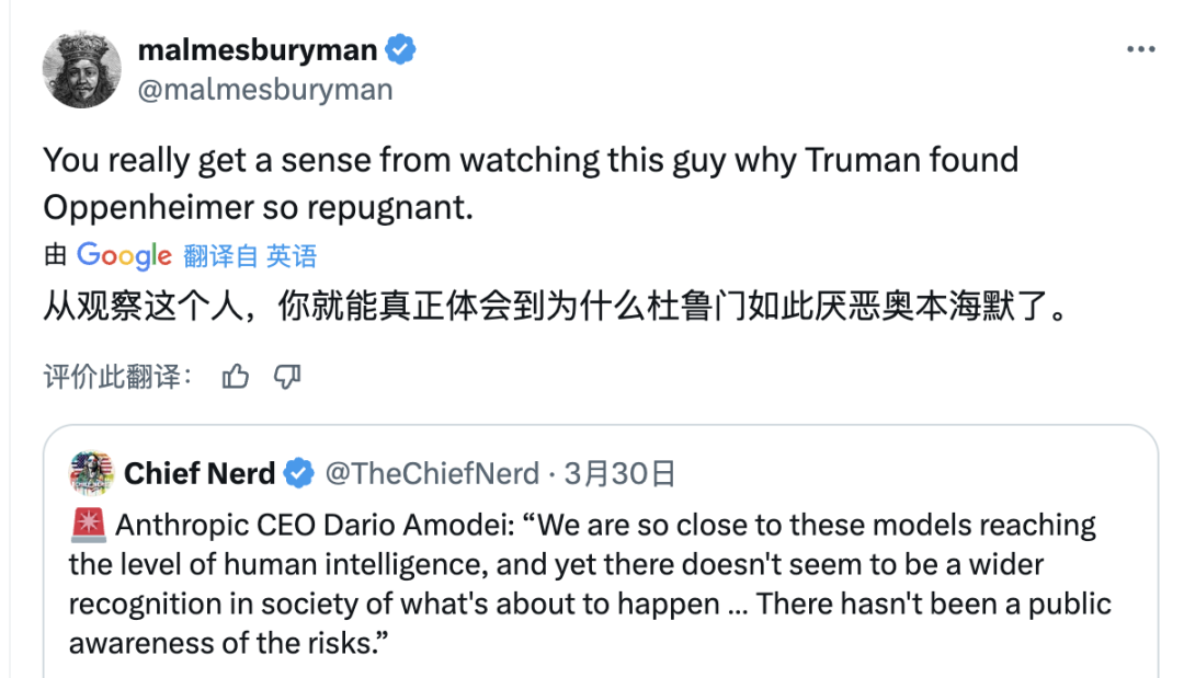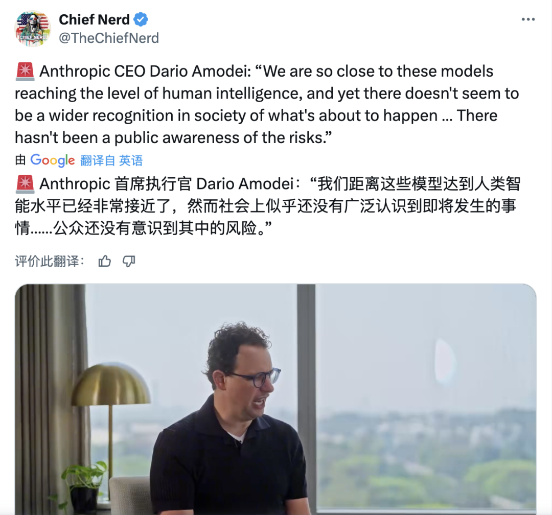用户@malmesburyman转发了Anthropic CEO Dario Amodei的采访片段,配文: