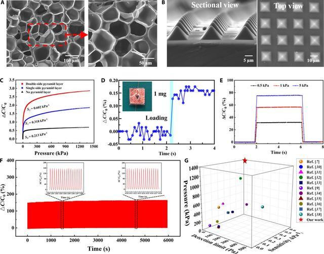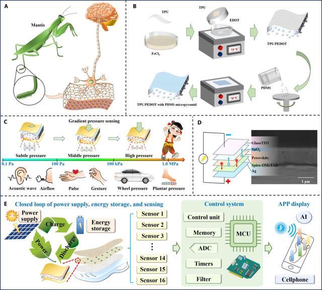受螳螂腿部启发,团队设计出一种双微结构电容传感器。它拥有惊人的“感知带宽”:检测下限低至 0.10 Pa,能敏感捕捉到如羽毛轻触般的微弱压力;最大量程高达 1.4 MPa,足以承受剧烈运动时的高强度冲击。