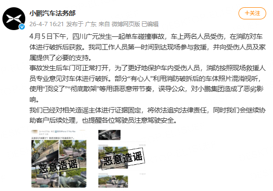 事故发生后车门可正常打开,为了更好地保护车内受伤人员,消防按照现场救援人员专业意见对车体进行破拆。部分“有心人”利用消防破拆后的车体照片混淆视听,使用“顶没了”“彻底散架”等用语恶意带节奏,误导公众,对小鹏集团造成了恶劣影响。