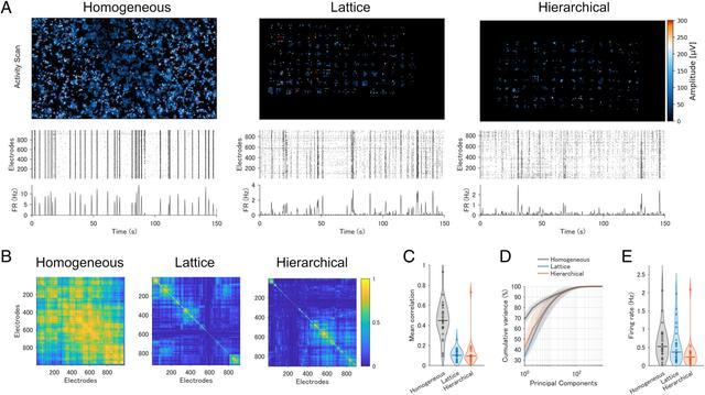 为此,团队将神经元胞体限制在 128 个微型微孔中,通过微通道连接,构建了格型(lattice)和分层(hierarchical)两种网络结构。这种设计显著提升了网络动力学维度,将神经元两两相关性从 0.45 降至 0.12。