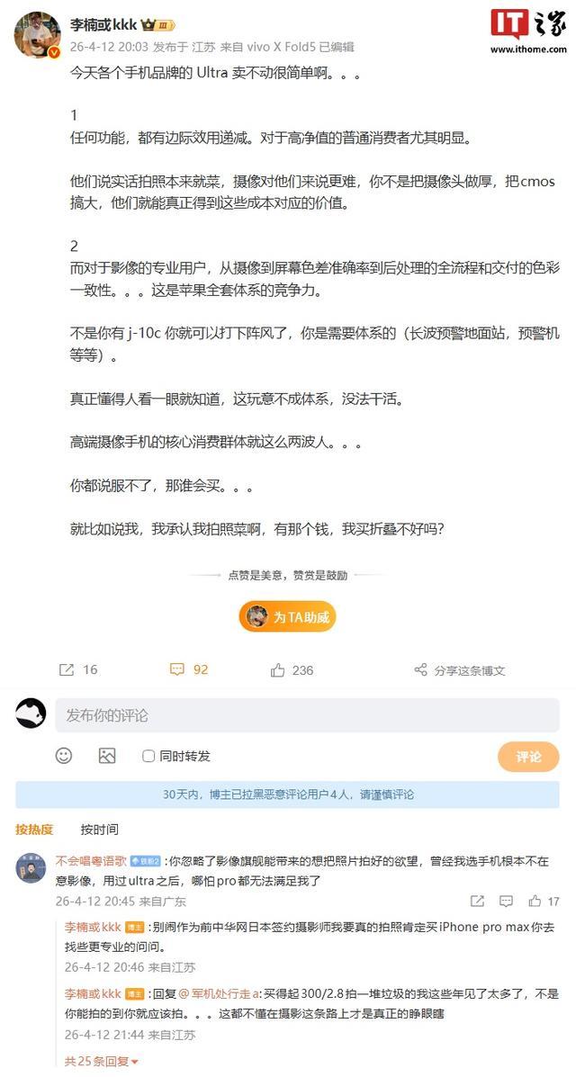 IT之家 4 月 13 日消息,Angry Miao 创始人、前魅族科技 CMO 李楠昨晚发文,谈及了如今各个手机品牌 Ultra 卖不动的原因。