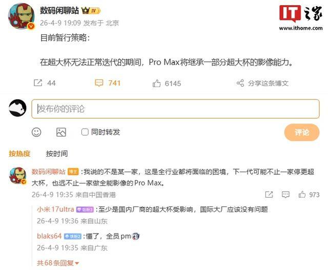 IT之家注意到,有爆料称因为内存价格暴涨,下一代可能有超大杯停更…… 而这是全行业都将面临的困境,下一代可能不止一家停更超大杯,也远不止一家做全能影像的 Pro Max。目前暂行策略是在超大杯无法正常迭代的期间,Pro Max 将继承一部分超大杯的影像能力。