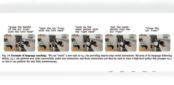 更令人振奋的是,当研究者采用“语言指导”的方式,像向新员工解释事情一样,逐步给出指令:“打开空气炸锅”“拿起红薯”“把红薯放进炸篮”“关闭空气炸锅”……π0.7能够精准地跟随这些实时指令,成功完成整个任务。