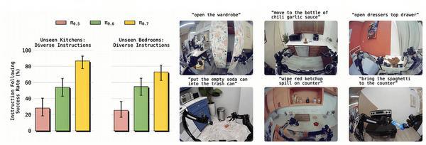 研究者在4个未见厨房和2个未见卧室中设计了14个指令遵循场景,每个场景需要机器人执行3-6步开放式指令,π0.7的整体指令遵循成功率显著高于前代。