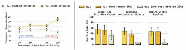 数据扩展性曲线:左图显示有元数据时,即使在数据质量下降的情况下,π0.7的性能仍能随数据量增加而持续提升;右图显示高任务多样性数据对泛化性能的关键贡献