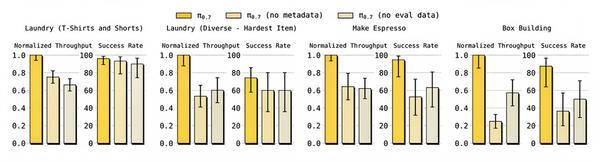 尽管π0.7也使用了网络预训练、人类视频等数据,但物理世界的交互数据仍然稀缺且昂贵。研究者承认,对于某些任务,零样本泛化的成功率(60-80%)仍然低于分布内任务(超过90%)。未来需要更高效的数据利用方法,例如利用π0.7本身的可引导性进行自主强化学习。