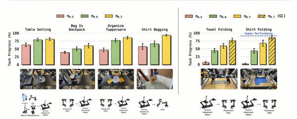 Physical Intelligence主要依靠与自家前代模型的对比,以及内部设计的一系列评分规则(如削蔬菜皮的完成百分比、折叠衣物的质量评分)。不同实验室之间的任务和环境差异很大,难以直接比较。