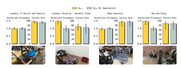 开箱即用性能对比: 展示π0.7与π0.6*专家模型在浓缩咖啡、盒子搭建、衣物折叠等任务上的成功率和吞吐量对比