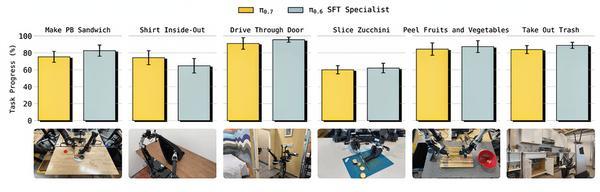 结果显示,π0.7在所有任务上都达到了与专用模型相当甚至更高的性能。