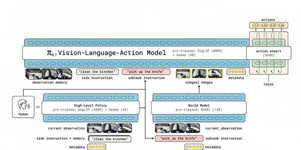 π0.7的发布,标志着机器人基础模型从“死记硬背”走向“组合泛化”的初步突破。它能够在零样本下完成空气炸锅烹饪、跨具身折叠衣物等从未见过的任务,性能媲美人类专家和RL微调专用模型。这背后是多样化上下文提示、元数据条件化(conditioning on metadata)和超大规模异构数据训练的共同作用。