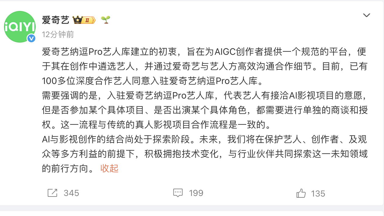 爱奇艺回应 “获上百位艺人AI授权”争议