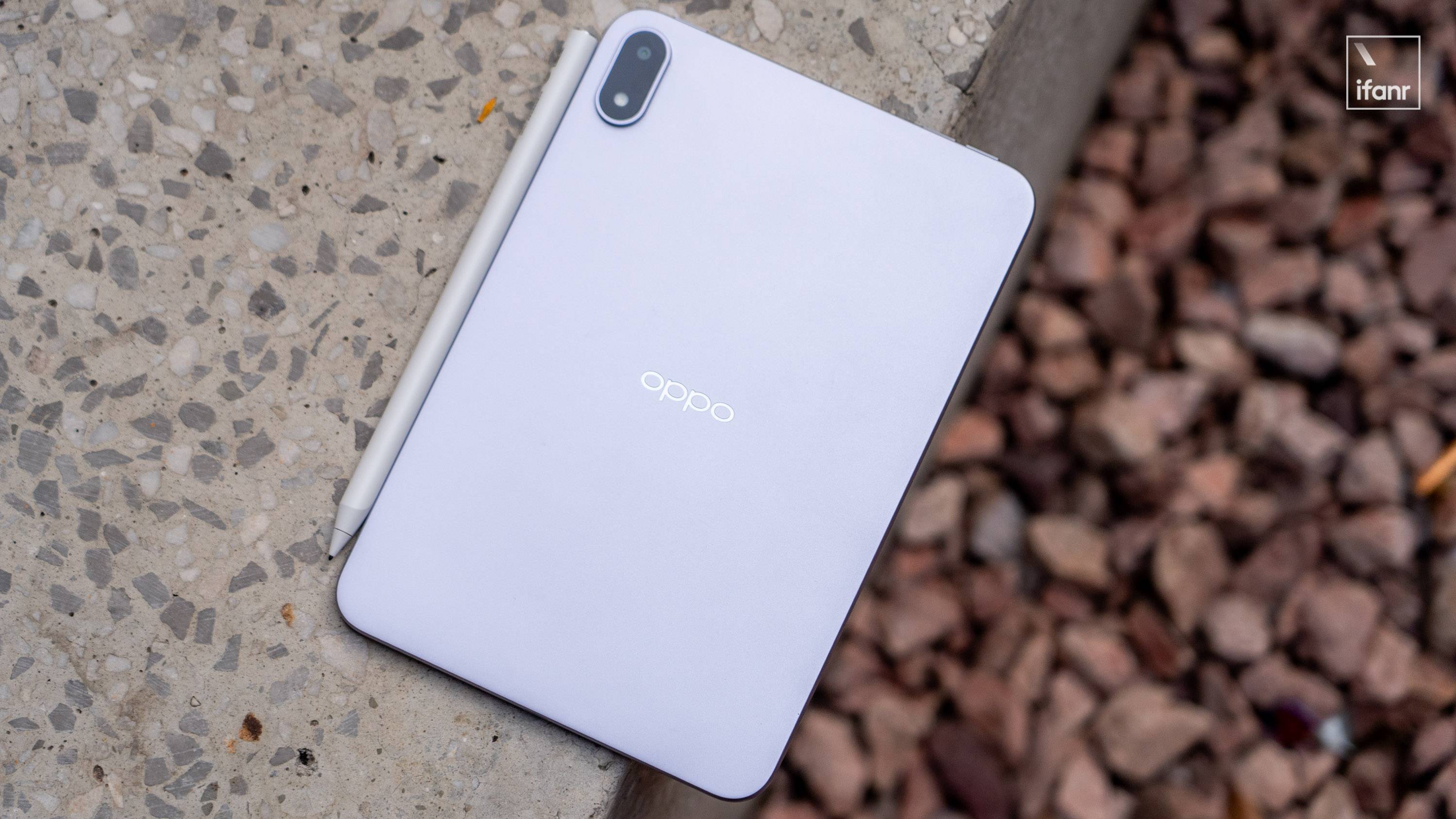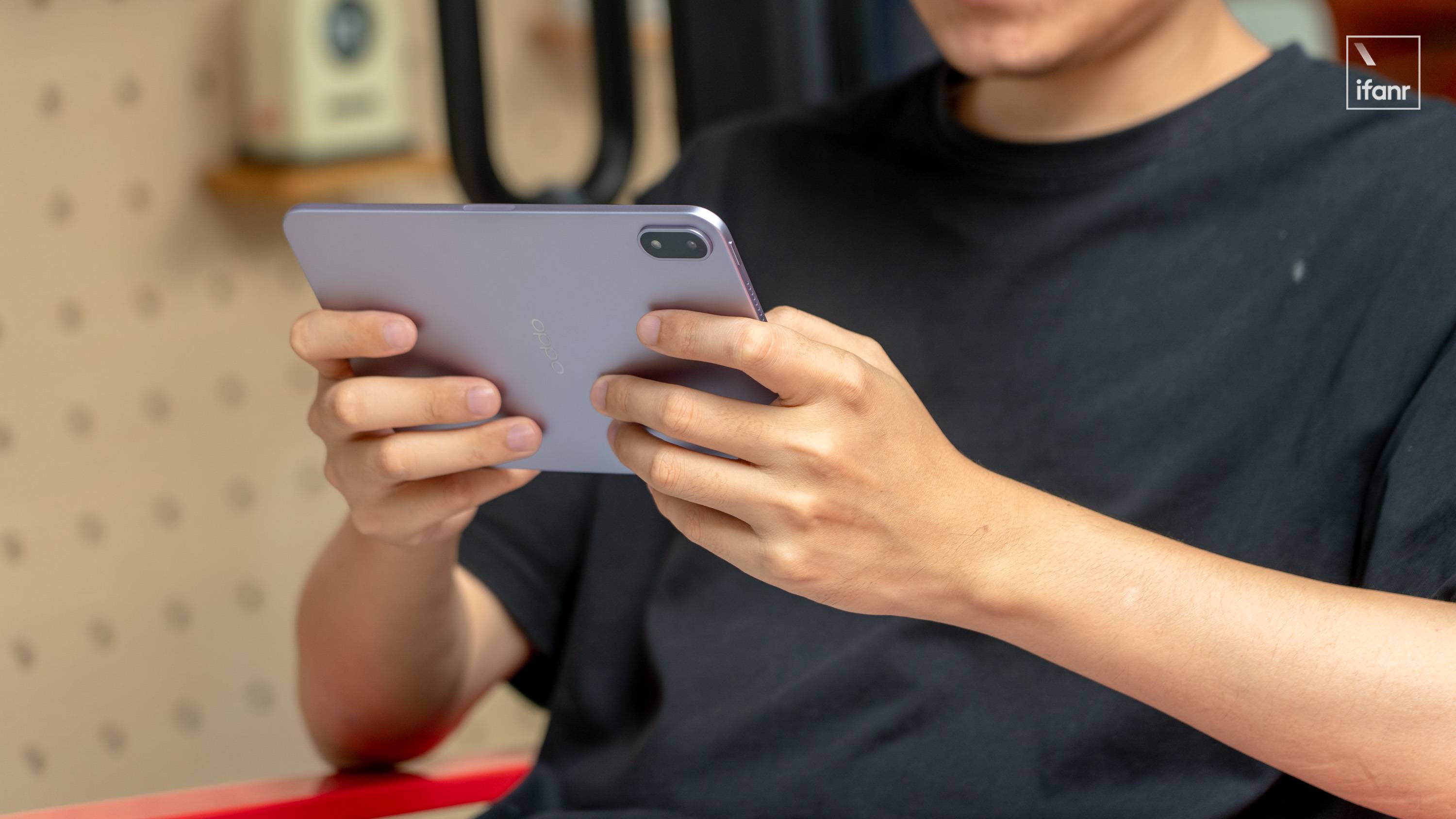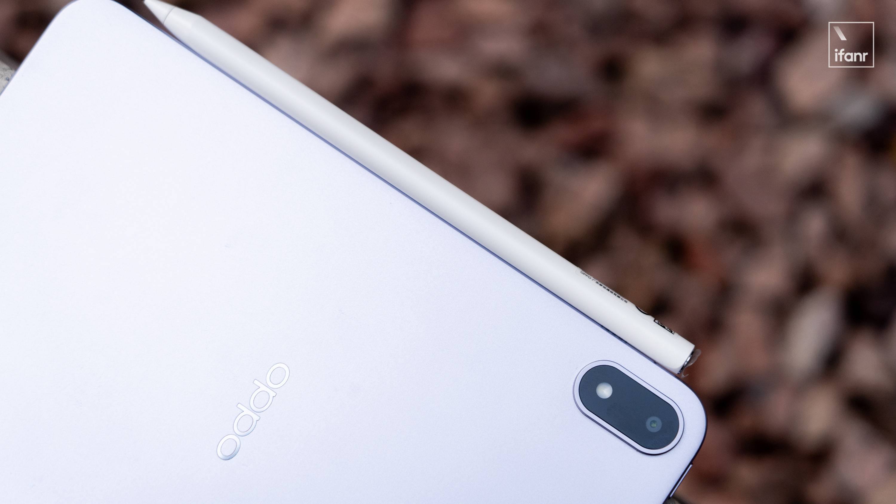 考虑到小平板主要的使用场景是游戏、笔记和阅读,OPPO 没有在后盖上添加用来连接保护壳、键盘的触点,后盖只保留了中心 Logo 和放在左上侧的「药丸形」DECO,横向握持时有足够的空间,不会被 DECO 挡住。