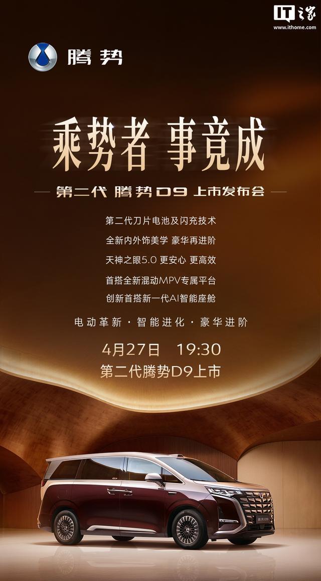 IT之家 4 月 22 日消息,比亚迪第二代腾势 D9 上市发布会今日官宣定档 4 月 27 日 19:30。