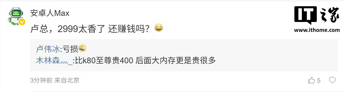 据IT之家昨日报道,小米集团合伙人、总裁、手机部总裁、小米品牌总经理卢伟冰刚刚在微博发文总结该机参数。其中一名网友询问道:“卢总,2999 太香了还赚钱吗?”,卢伟冰回应:“亏损”。