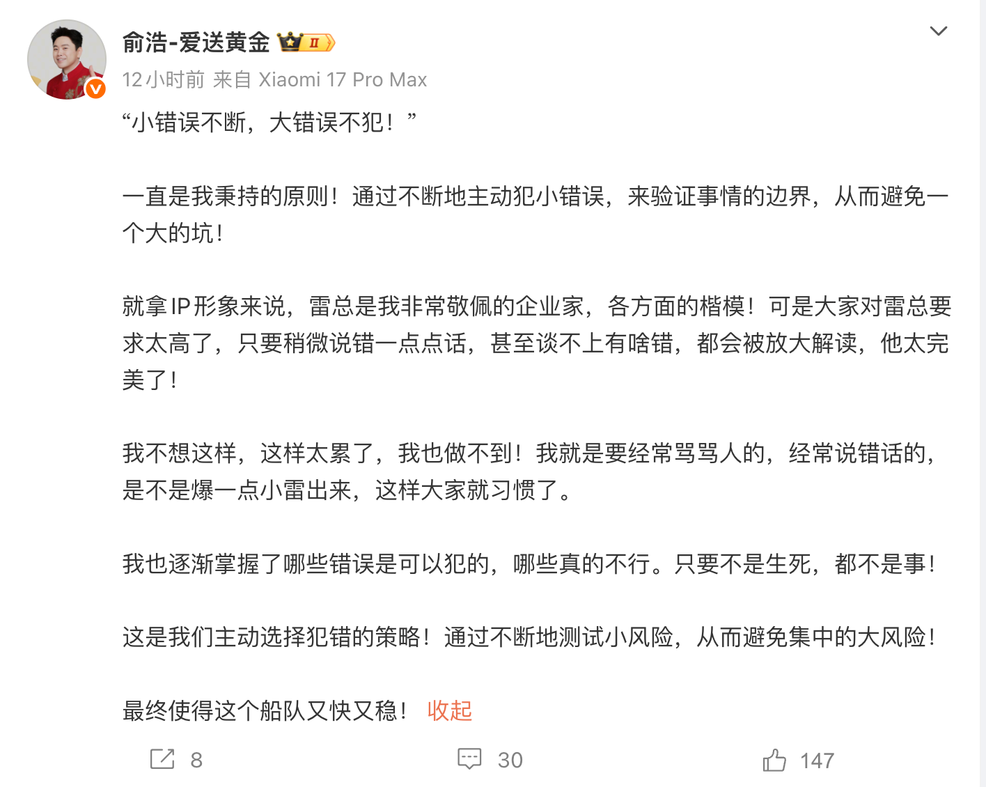 凤凰网科技讯 4月23日,追觅科技创始人兼CEO俞浩发文称:“就拿IP形象来说,雷总是我非常敬佩的企业家,各方面的楷模!可是大家对雷总要求太高了,只要稍微说错一点点话,甚至谈不上有啥错,都会被放大解读,他太完美了!”俞浩还表示自己不想这样,这样太累了,我也做不到。