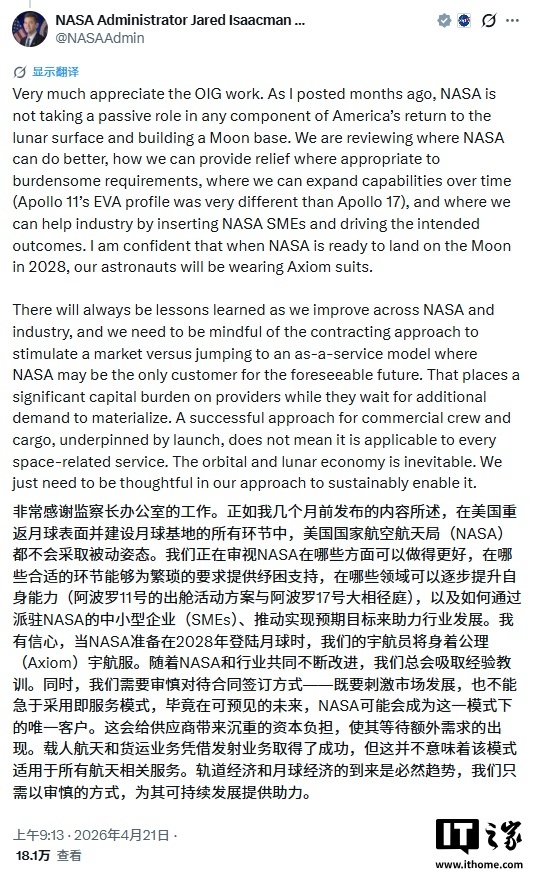 监察长办公室报告发布当日(周一),艾萨克曼在社交平台 X 上发文:“我有信心,2028 年 NASA 如期开展登月任务时,我们的宇航员将身着公理太空研发的宇航服登陆月球。”