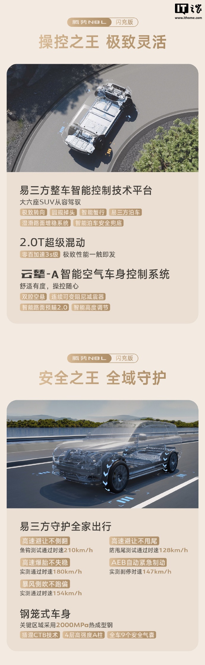 安全方面,新车支持高速避让不侧翻,鱼钩测试通过时速 210km/h;高速避让不甩尾防,防甩尾测试通过时速 128km/h;高速爆胎不失稳,实测通过时速 180km/h;AEB 自动紧急制动,实测刹停时速 147km/h;暴风侧吹不跑偏,实测通过时速 154km/h。