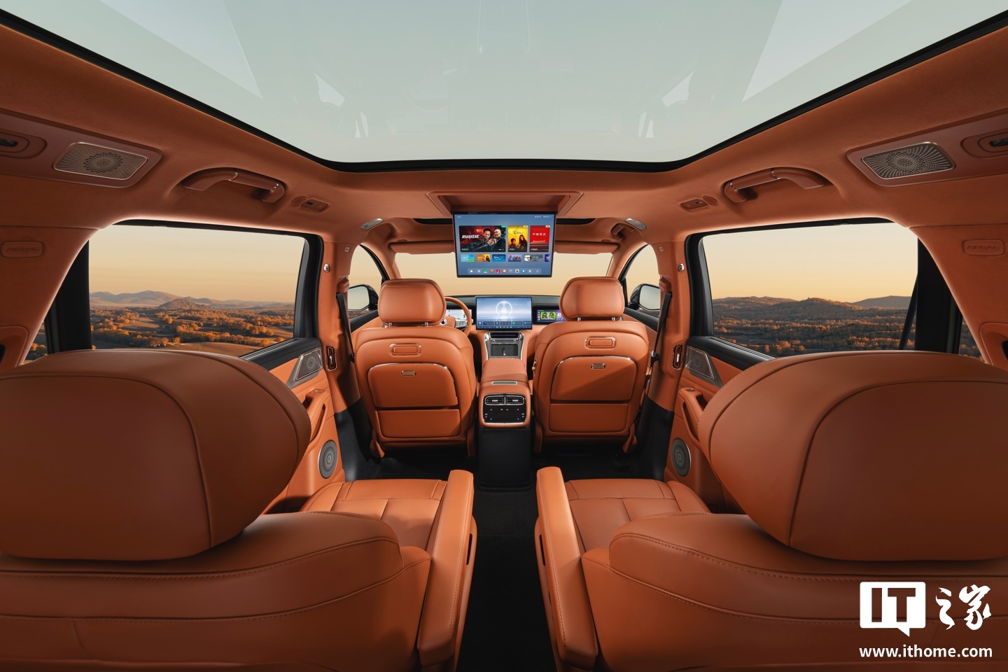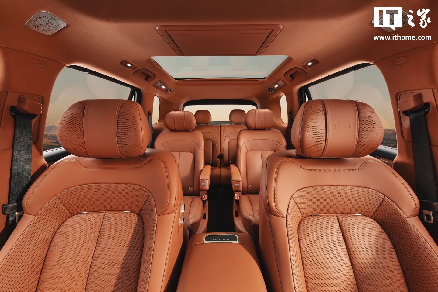 据介绍,比亚迪腾势 N8L 闪充版汽车采用六座布局,配备 Nappa 云感舒压座椅,并辅以超纤麂皮云绒顶棚。新车车顶还搭载二排娱乐屏和天空音声道。
