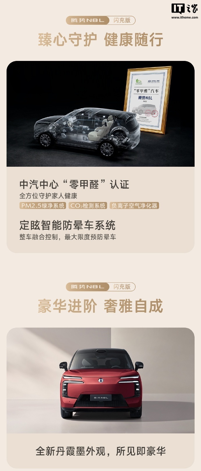 据IT之家此前报道,腾势 N8L 闪充版已于 4 月 10 日开启预售,预售价 35-40 万元,享 18 个月免费闪充权益,全新丹霞墨外观。
