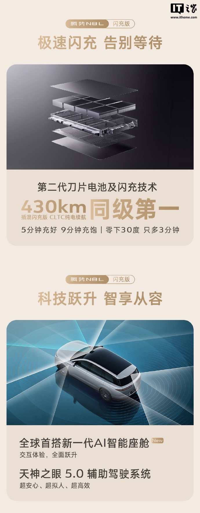 这款新车标配第二代刀片电池,插混闪充版纯电续航 430km 同级第一,号称“5 分钟充好,9 分钟充饱”“零下 30 度,只多 3 分钟”。新车全球首搭新一代 AI 智能座舱,搭载天神之眼 5.0 辅助驾驶系统。