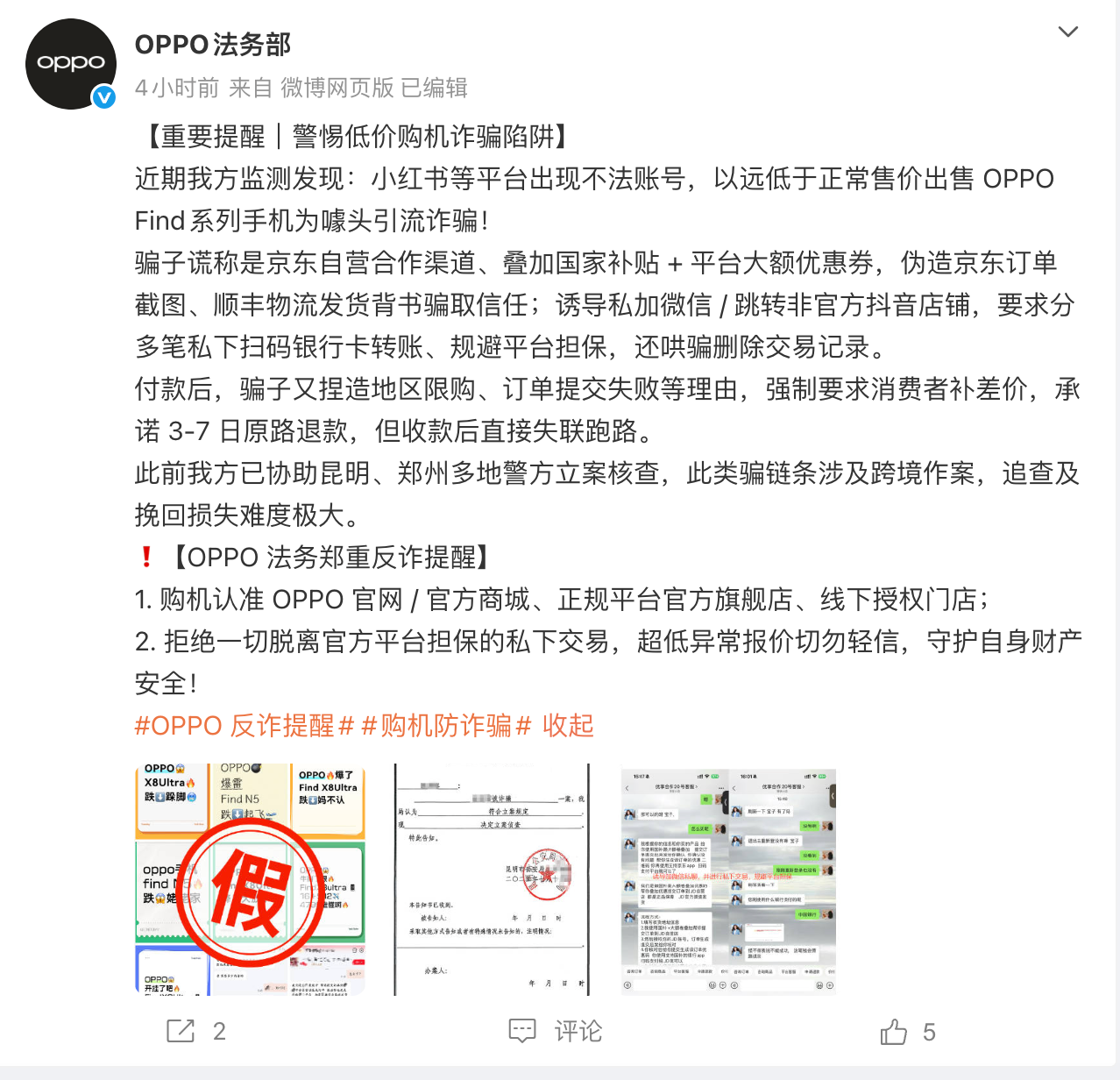 凤凰网科技讯 4月24日,OPPO法务部发文提醒,警惕低价购机诈骗陷阱。OPPO法务部称,近期监测发现小红书等平台出现不法账号,以远低于正常售价出售OPPO Find系列手机为噱头引流诈骗。