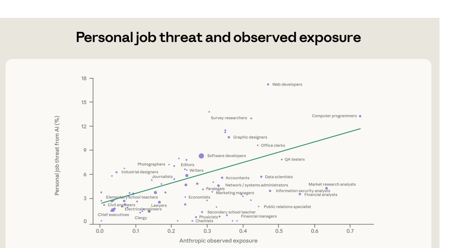 报告原作者写了一句“job threat 随 AI 加速程度单调递增”,没有往下展开。但这一句话背后是整件事情的核心: