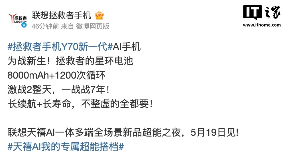 IT之家 4 月 24 日消息,联想拯救者手机 Y70 新一代将于 5 月 19 日正式发布,官方今日对新机进行预热,新机搭载 8000mAh 星环电池,可达 1200 次循环,7 年电池健康≧80%“一战战 7 年”。