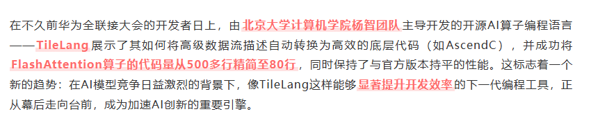 但咱们也不能一直活在别人屋檐下。构建属于自己的软件生态,迫在眉睫。所以最近几年托尼也开始看到像 TileLang 这类由中国主导的生态项目,尝试在不同的方向构建出属于自己的护城河。