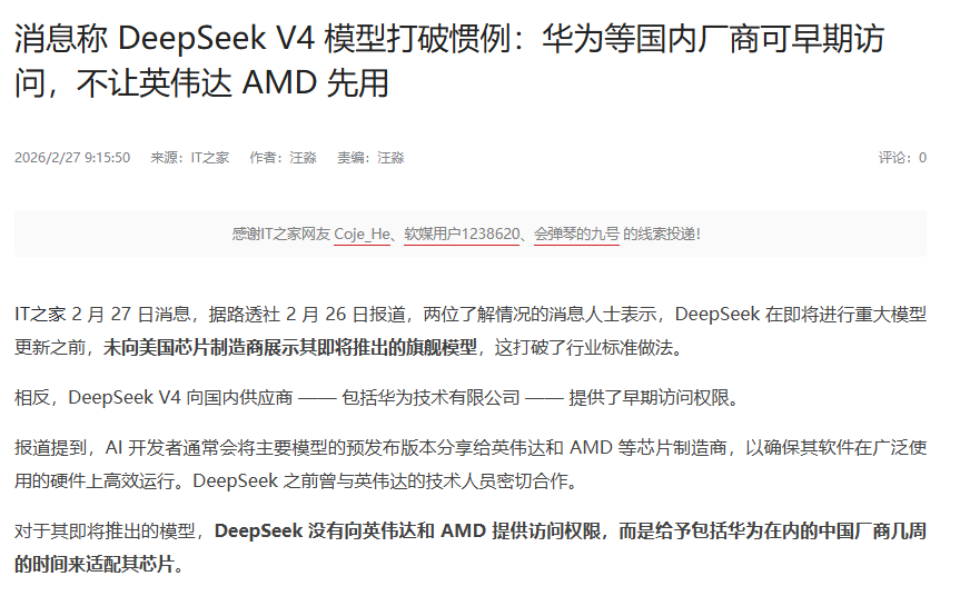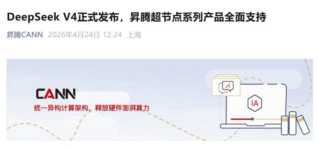 直到这次的 DeepSeek V4 更进一步,直接拒绝了英伟达和AMD的提前适配,而是选择华为昇腾和国产 CANN 软件生态。