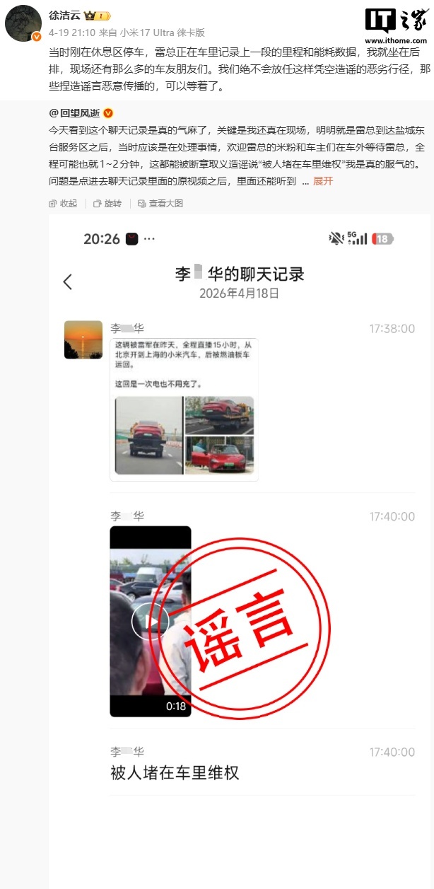 据IT之家 4 月 19 日报道,小米集团董事长特别助理、战略市场部副总经理徐洁云在微博发文,就网络传闻“雷军被人堵在车里维权”作出回应。