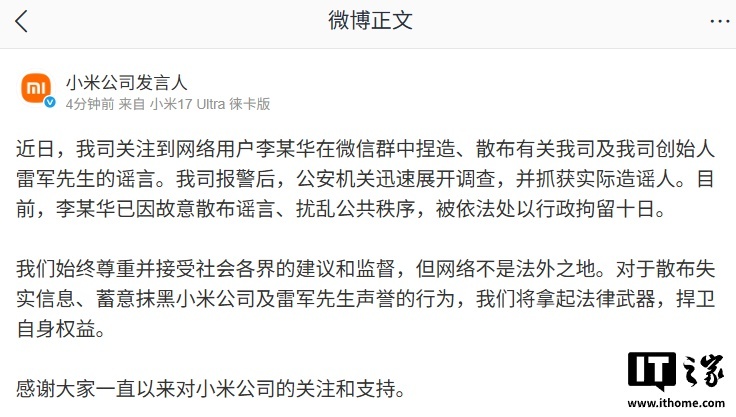 IT之家 4 月 26 日消息,小米公司发言人今日发文称:“近日,我司关注到网络用户李某华在微信群中捏造、散布有关我司及我司创始人雷军先生的谣言。我司报警后,公安机关迅速展开调查,并抓获实际造谣人。目前,李某华已因故意散布谣言、扰乱公共秩序,被依法处以行政拘留十日。”