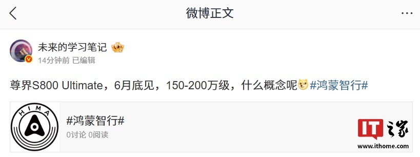 IT之家 4 月 26 日消息,博主 @未来的学习笔记 今日分享,尊界 S800 Ultimate 新车将在 6 月底亮相。根据博主微博原文来看,新车预计定位 150-200 万级。