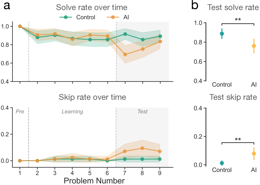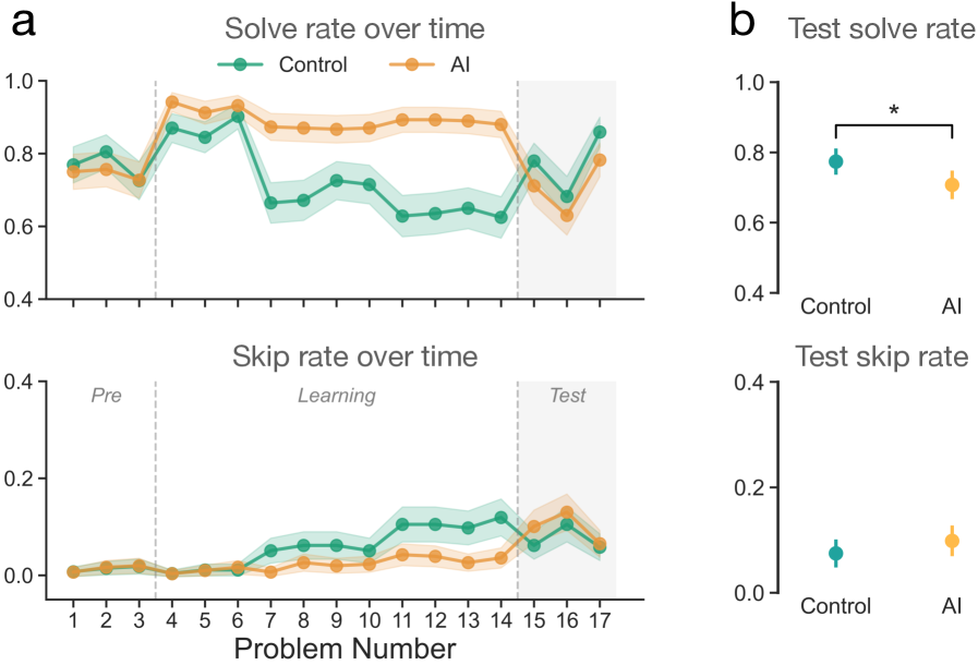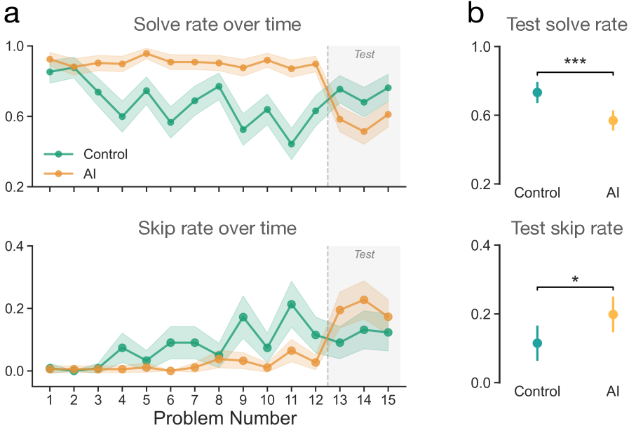 AI会削弱人在没有辅助时的表现和坚持完成任务的意愿。(a)按题目出现顺序统计的参与者每题平均解答率和跳过率,并给出95%置信区间(CI)。灰色虚线表示学习题与测试题之间的分界。整个实验中,题目难度逐步提升:依次为一步骤题(第1—4题)、两步骤题(第5—8题)和三步骤题(第9—12题)。(b)图为参与者在测试阶段的平均解题率与跳过率,附95%置信区间。测试指标通过对每位参与者最后三道测试题的表现取平均值计算得出。