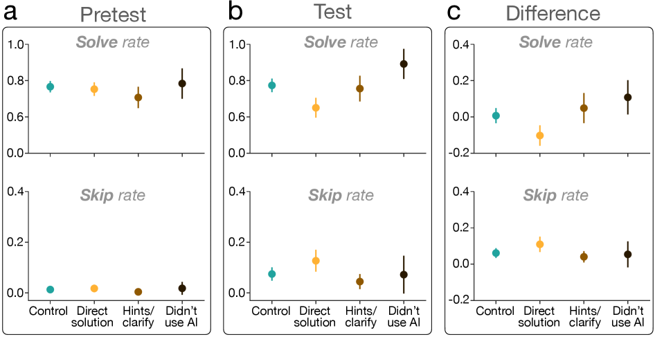 表现下滑与坚持度减弱,主要集中在直接从AI获取答案的参与者身上。(a)各AI使用组在摸底测试阶段的解题率与跳过率无显著差异(单因素方差分析),表明各组初始技能水平与参与动机基本相当。(b)各组在测试阶段存在显著差异(单因素方差分析):直接使用AI获取答案的参与者在测试时解题率最低、跳过率最高。(c)与自身摸底测试表现相比,直接使用AI获取答案的参与者解题率下降,跳过率上升,表明其参与度有所降低。其他组的测试表现与前测相比持平或有所提升。