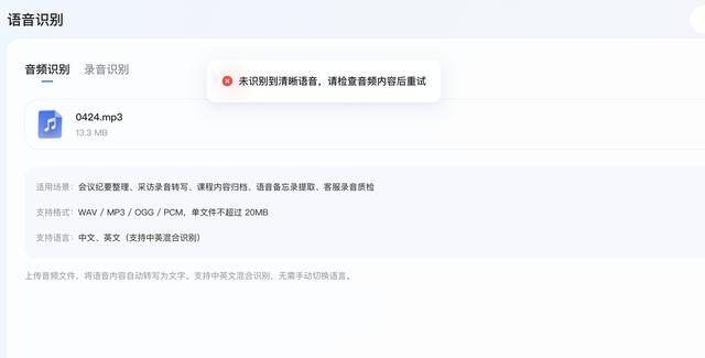 不过,在多次上传该音频后,系统均提示未检测到清晰语音,未能完成有效转写,相关原因尚不明确。