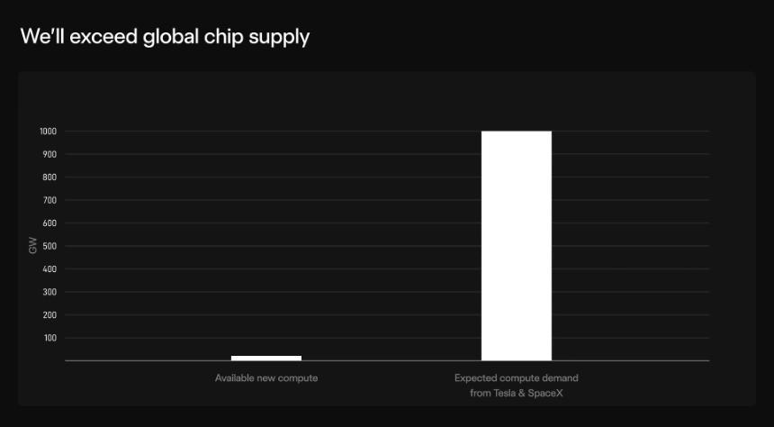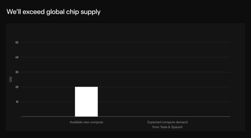 所有这些都需要大量的芯片:仅Optimus机器人就需要100-200GW的芯片,另外还需要为太阳能AI卫星提供太瓦级(1000GW)的芯片。