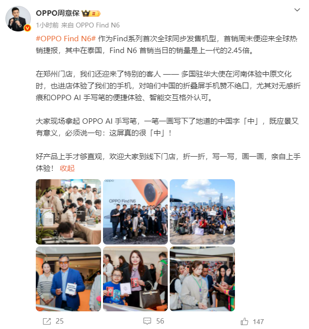 市场销售数据显示,Find N6 上市初期引发抢购热潮。据天猫、京东平台数据,该机型首销当日销售额,创下近一年来全品牌、全形态折叠屏产品的首销日全新纪录。周意保在微博中补充提及,郑州门店还迎来多国驻华大使到访。大使们在体验中原文化的同时,进店体验了 OPPO Find N6,对这款中国折叠屏手机的无感折痕、OPPO AI 手写笔的便捷操作及智能交互功能给予高度评价。现场嘉宾使用 OPPO AI 手写笔书写中国字「中」,直观感受了产品的使用体验。
