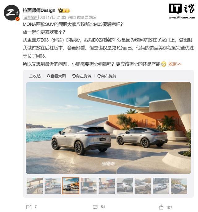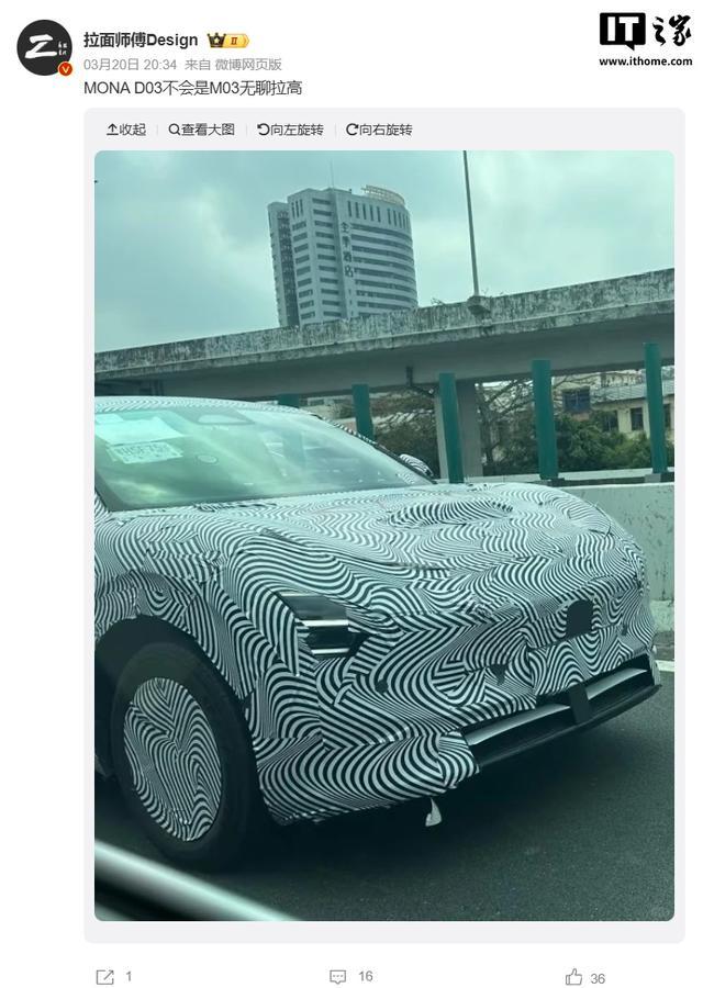 IT之家 3 月 23 日消息,小鹏 MONA 系列首款 SUV 车型今日在网上曝光了谍照,多位博主称这款车命名可能是 MONA D03,是一款轿跑 SUV。