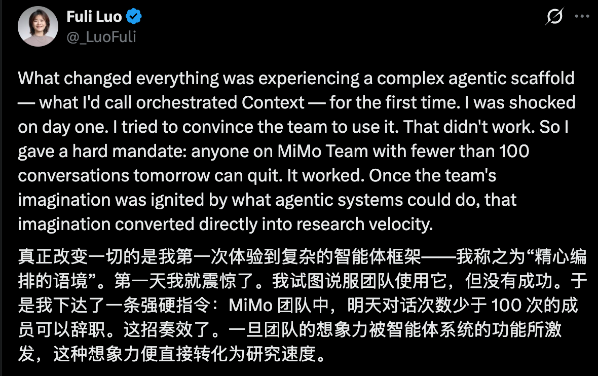 So I gave a hard mandate: anyone on MiMo Team with fewer than 100 conversations tomorrow can quit.