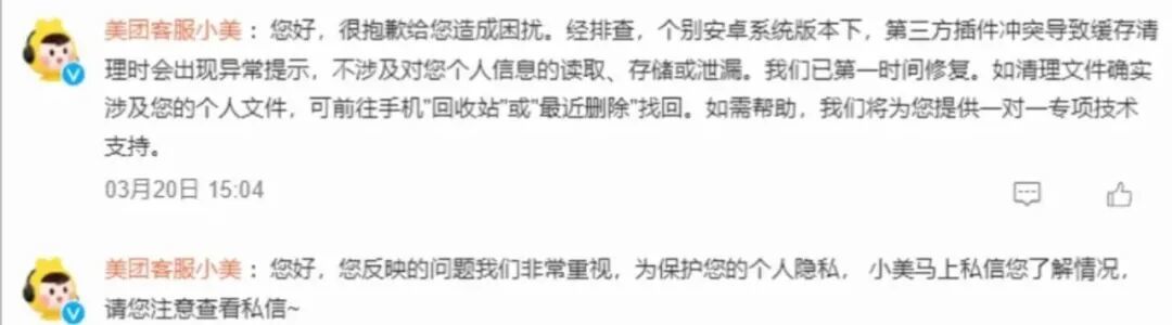 有客服账号回复说:称经排查,个别安卓系统版本下,第三方插件冲突导致缓存清理时会出现异常提示,不涉及对您个人信息的读取、存储或泄漏。我们已第一时间修复。如清理文件确实涉及您的个人文件,可前往手机"回收站"或"最近删除"找回。如需帮助,我们将为您提供一对一专项技术支持。